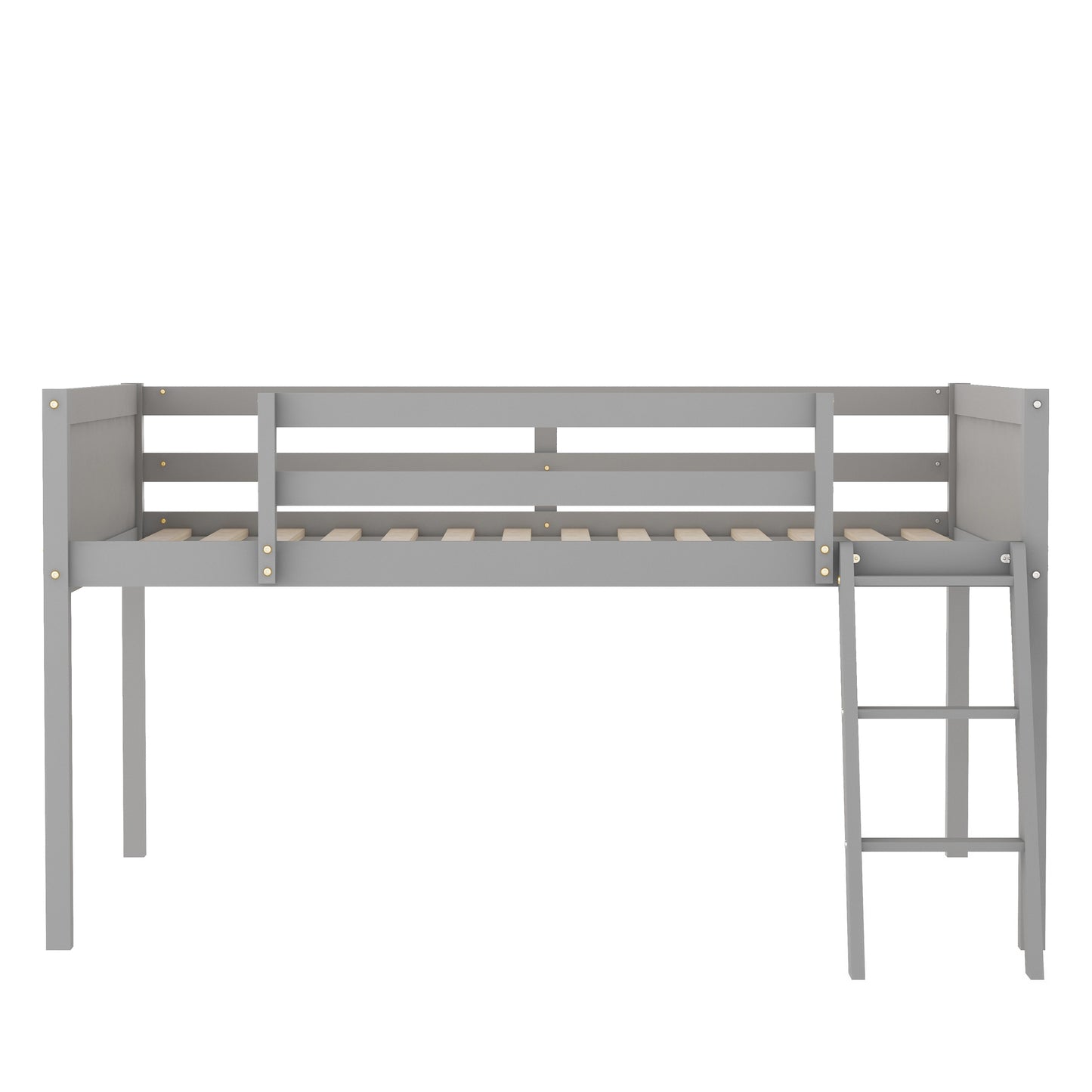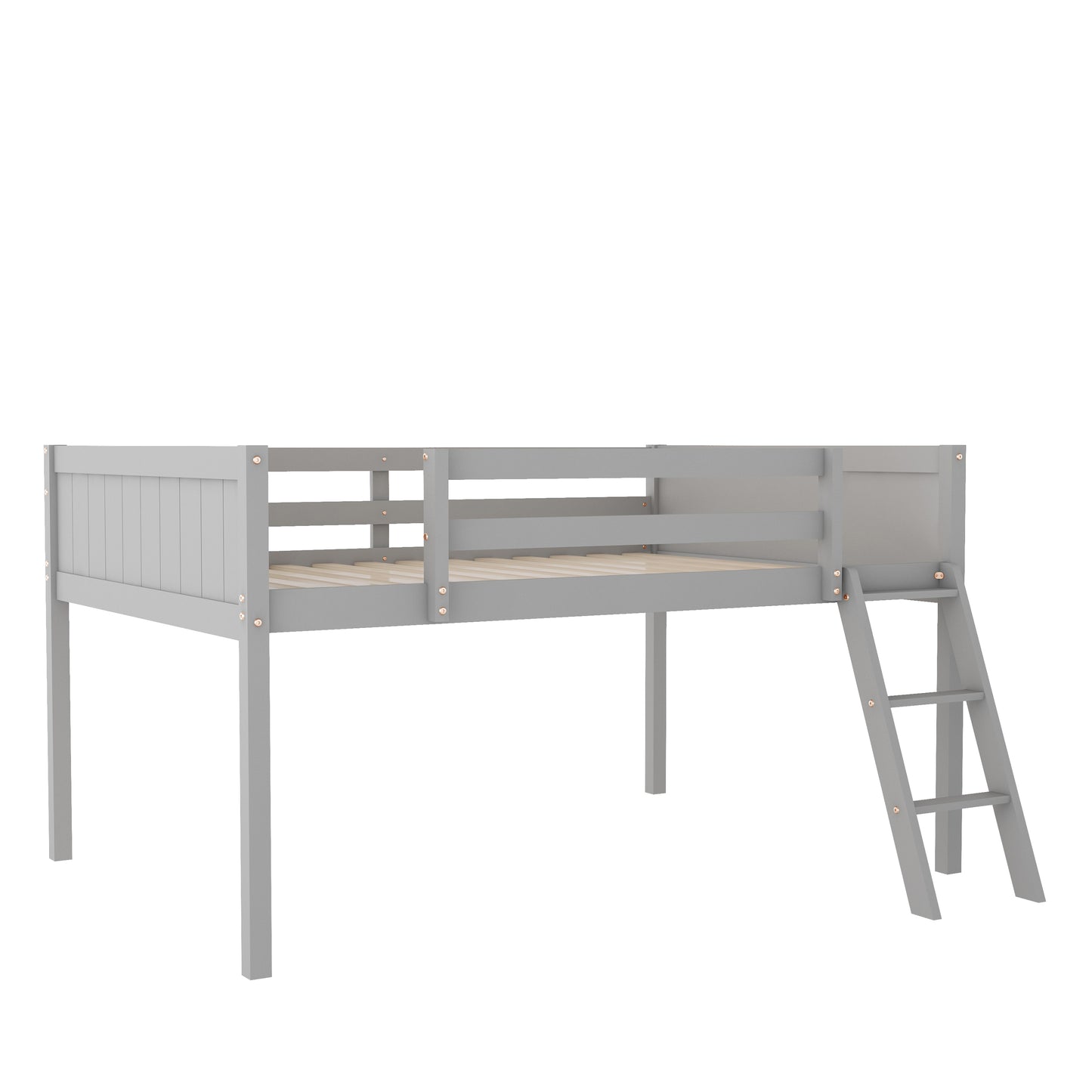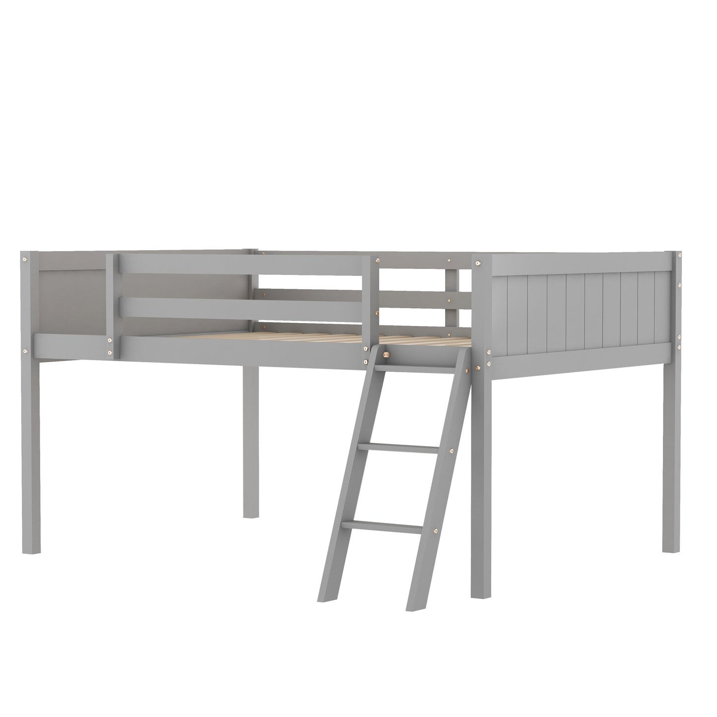 Full Size Wood Low Loft Bed with Ladder, ladder can be placed on the left or right, Gray