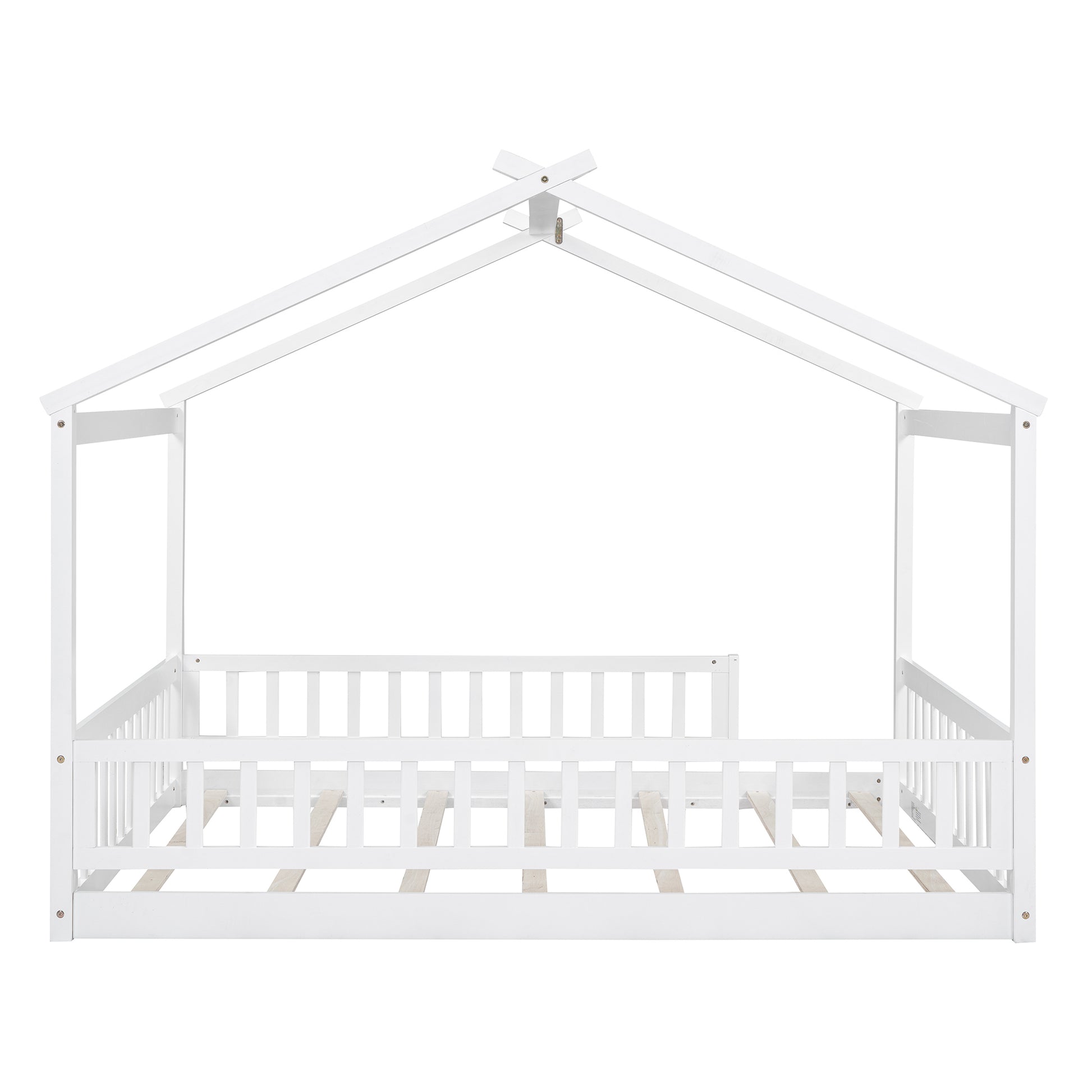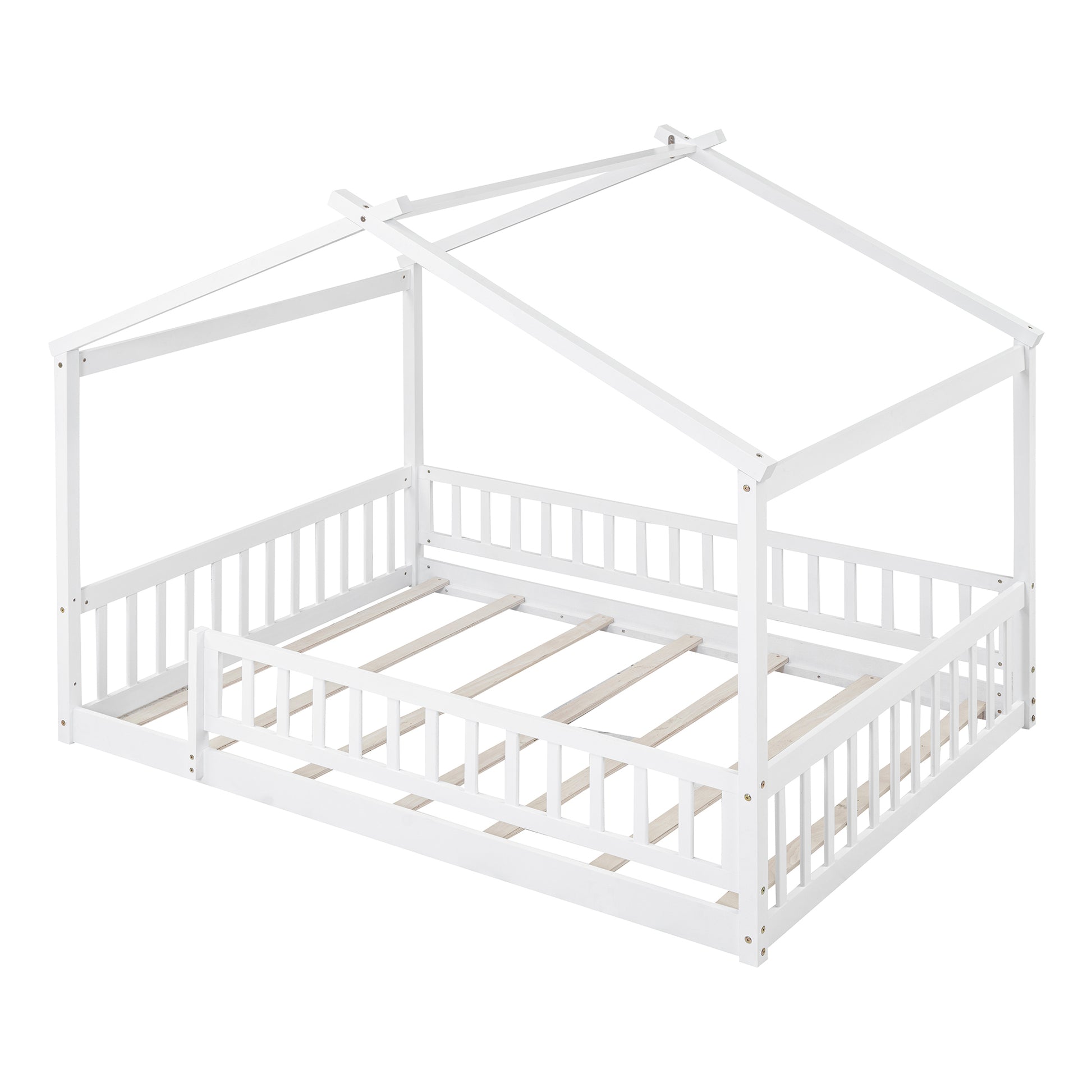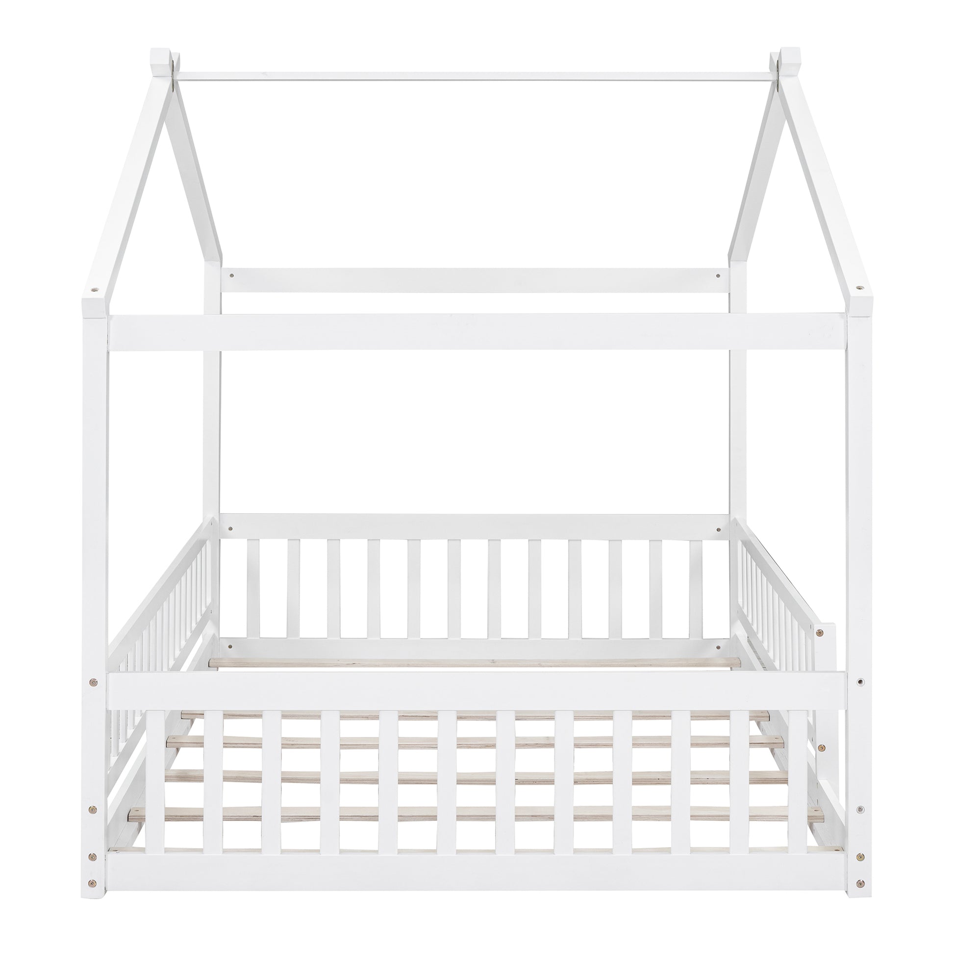 Full Size Wood Bed House Bed Frame with Fence, for Kids, Teens, Girls, Boys,White