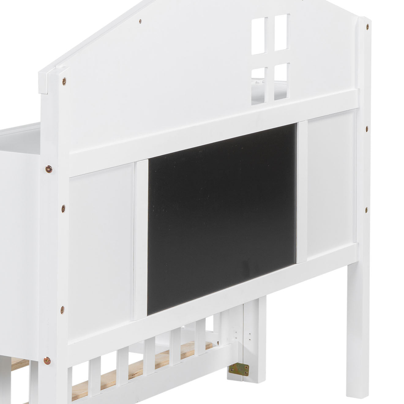 - 3.FUN AND SAFE DESIGN: The bed frame has a chalkboard on the back of the headboard so you can doodle according to your imagination and preference. The small door that can be opened and closed adds fun to the bed and creates a safer sleeping space.
