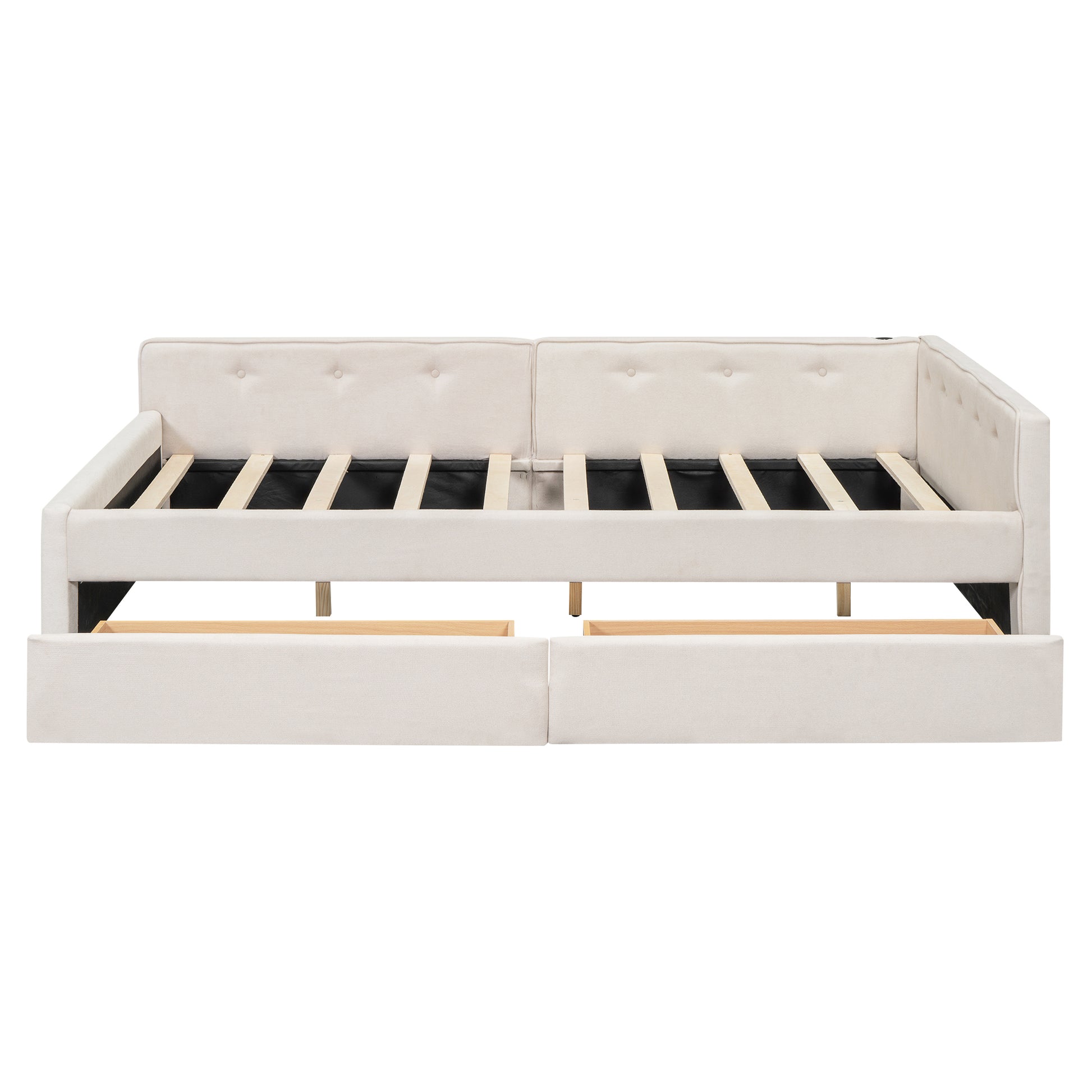 Full Size Upholstered Platform Bed with USB and 2 Drawers, Beige