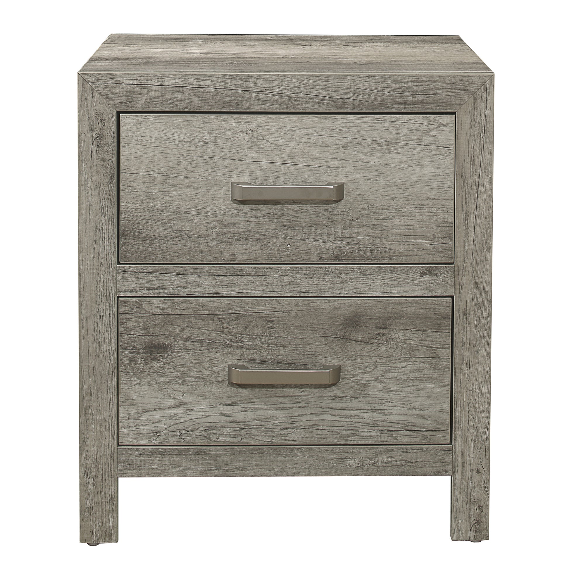 Utilizing faux wood veneer creates the look of authentic wood planks with the gray finish further lending to the rusticated style. Satin nickel bar hardware fronts each drawer providing contrasting complement to the nightstand.