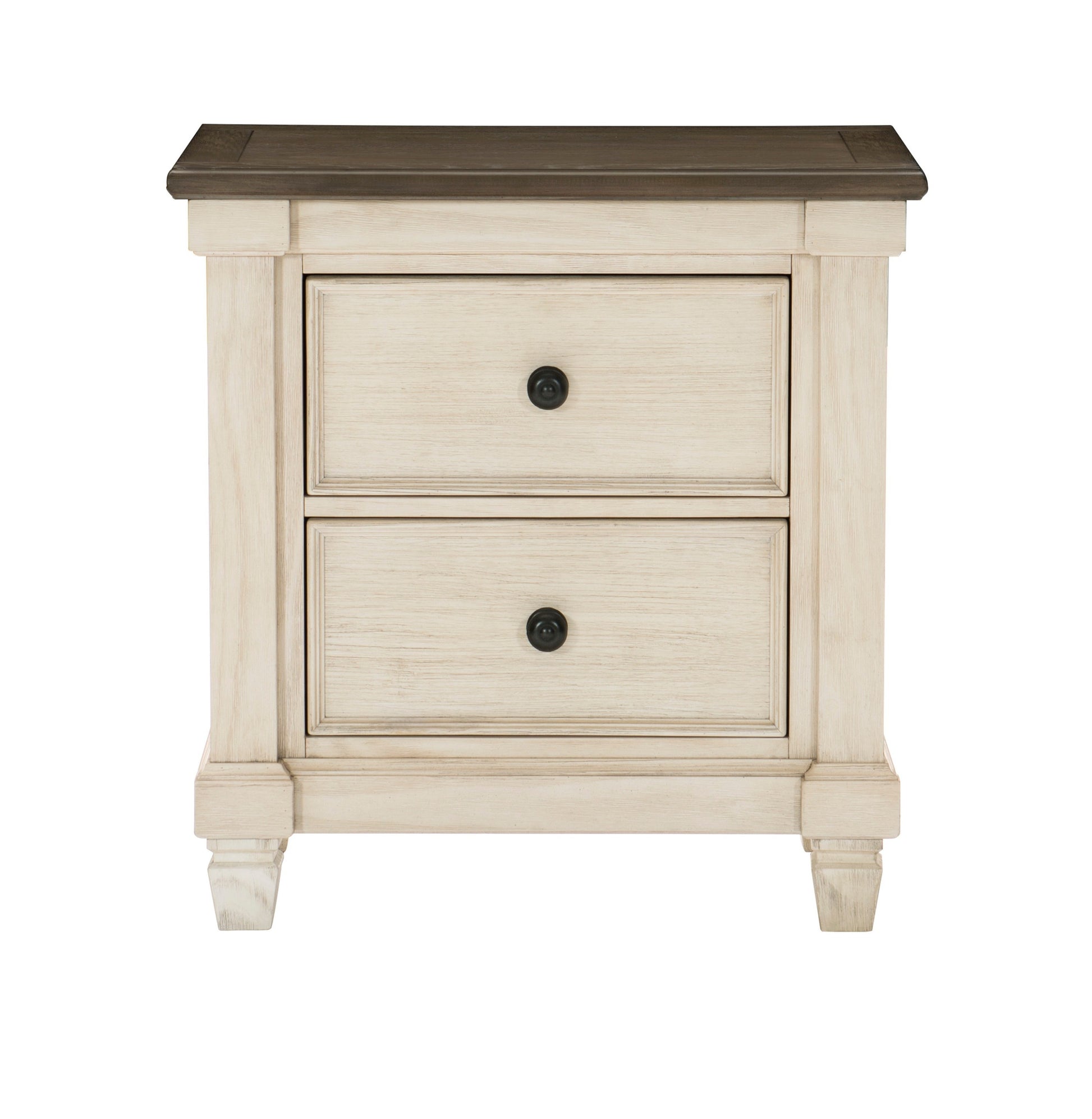 Transitional-rustic styling is expertly achieved in the design of the Weaver Collection. Antique white provides bold contrast to the rosy brown plank-style tops, with pine solids and oak veneer further lending visual texture to the nightstand. Classic framing paired with dark metal knob hardware complete the rustic look.