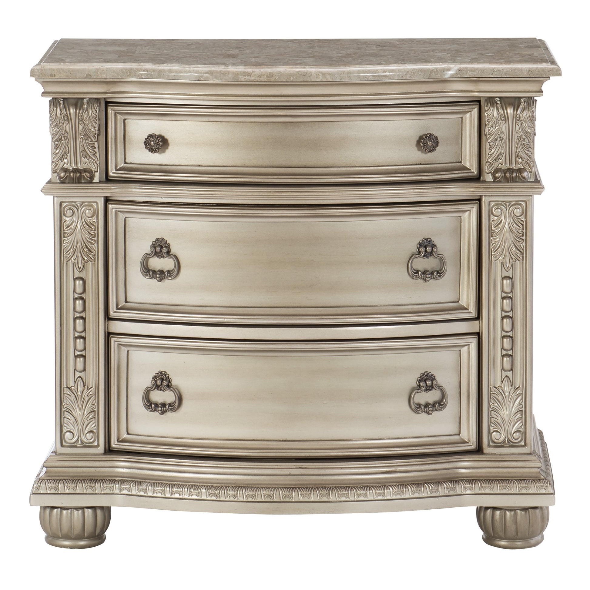 The Cavalier Collection exemplifies the finest in Old World European design inspiration. Egg and dart base moldings, bead molding, acanthus leaf carvings, and genuine marble top all blend to achieve an elegant addition for your traditional bedroom. The nightstands beautiful details are accented by the silver finish on birch veneer.