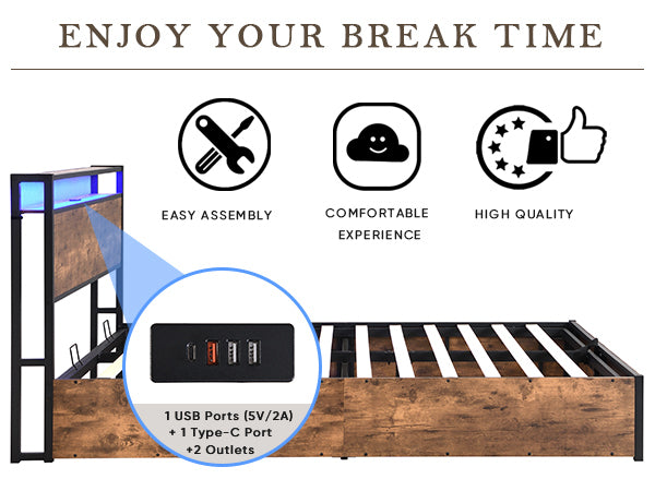 - Smart Storage and Charging Integration: Our platform bed features a versatile headboard with two-tier storage shelves, perfect for keeping books, decorations, and personal items within arm's reach. Plus, with 1 Type-C and 3 USB ports built into the headboard, charging your phone, tablet, or other electronic devices has never been easier, allowing you to unwind and relax without worrying about battery life.