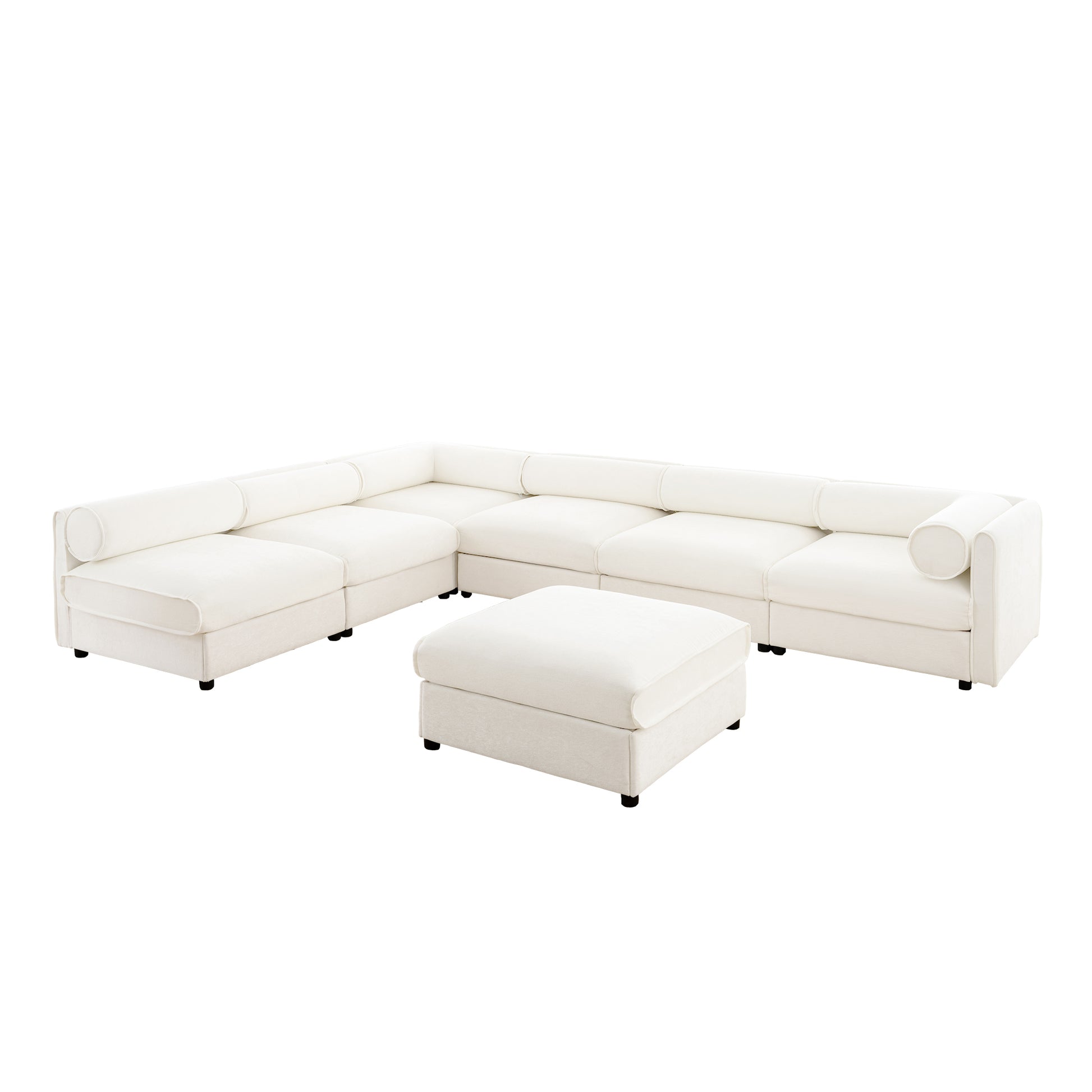 Modern 6-Piece Modular Sectional Sofa with Storage in Soft White Chenille Fabric, Contemporary Cylindrical Design