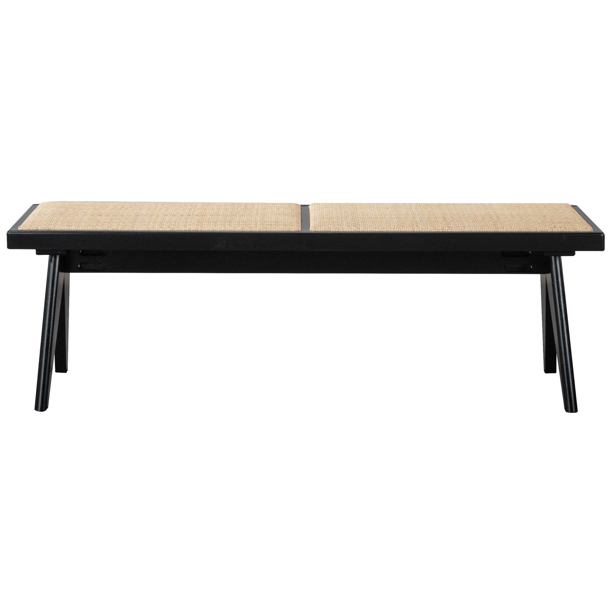 - Crafted with meticulous precision, this bench effortlessly transitions between roles, serving as an inviting entryway bench, an elegant bedroom accent at the foot of your bed, a stylish dining companion, or a focal point of comfort and sophistication in your living room. The union of natural rattan and black solid wood results in a visually striking appeal, offering a modern twist with subtle mid-century undertones.