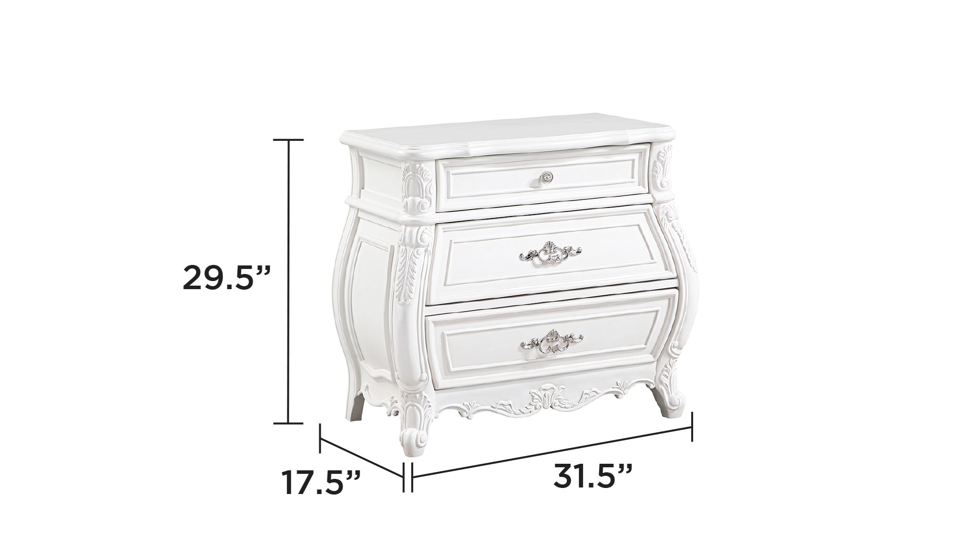 Enhance your bedside setup with this luxurious nightstand, designed to perfectly complement your elegant bedroom décor. The beautifully carved details and pearl finish add a touch of sophistication, while the three spacious drawers offer practical storage for all your nighttime essentials. Whether used for holding a lamp, books, or personal items, this nightstand brings both functionality and style to your room.