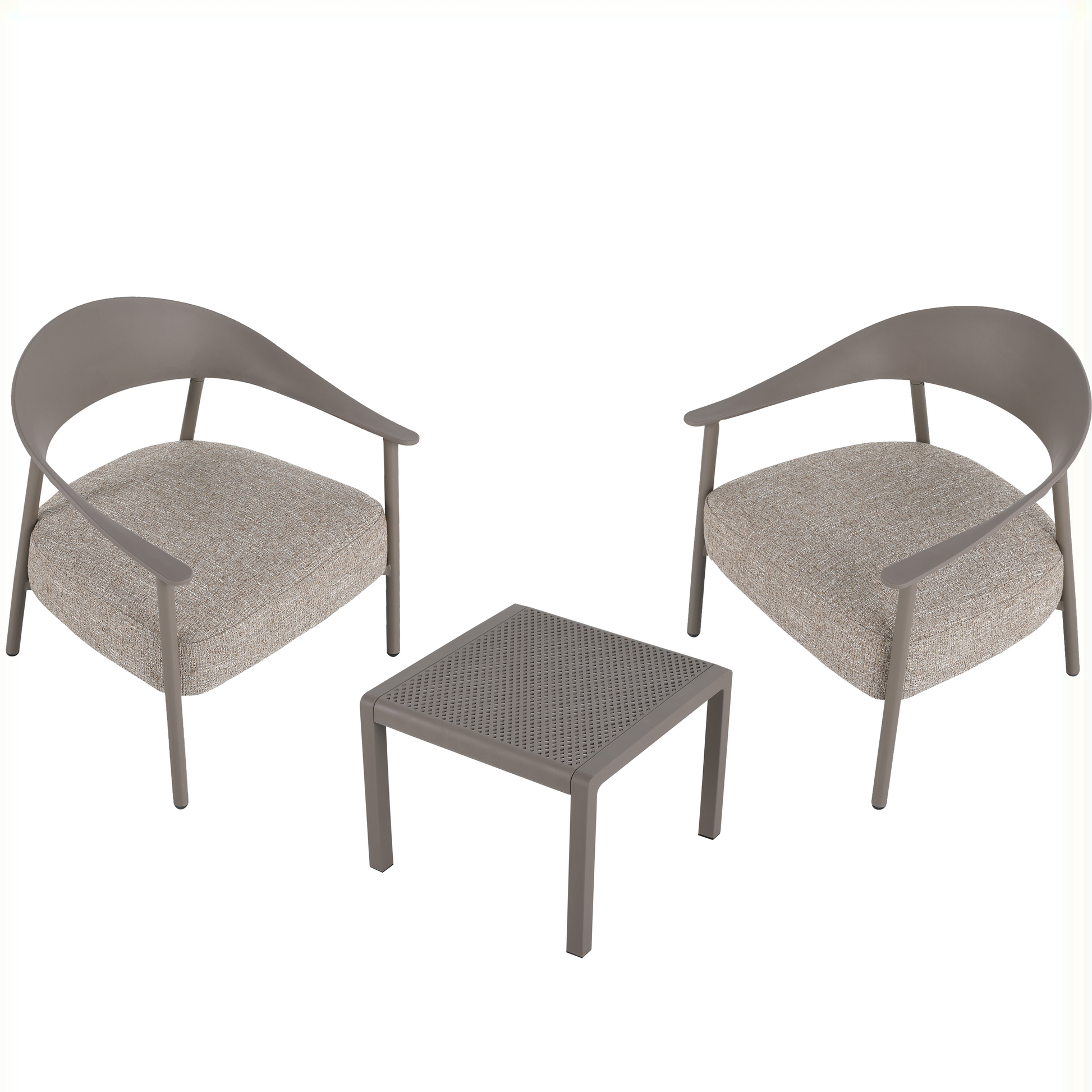 Furniture Set with Seat Cushions, Sturdy and Durable, in Warm Grey. Dimensions: 29.13*25*29.53 (in)/19.69*19.69*14.96 (in). Chair Body made of Plywood, Powder-coated Metal Legs, and PP Table.