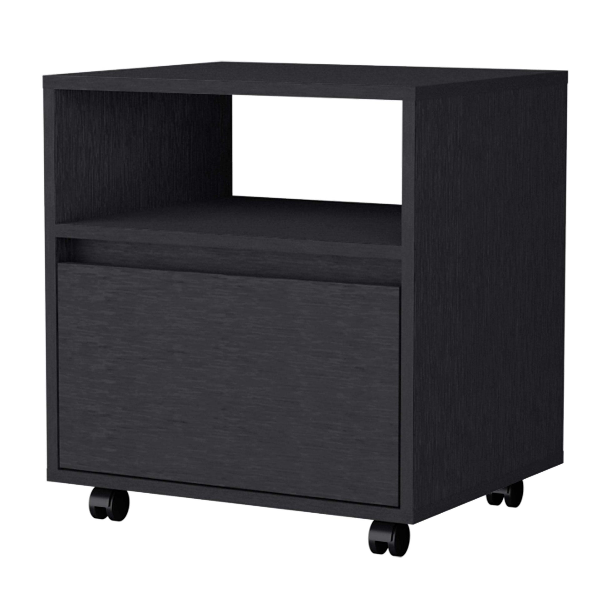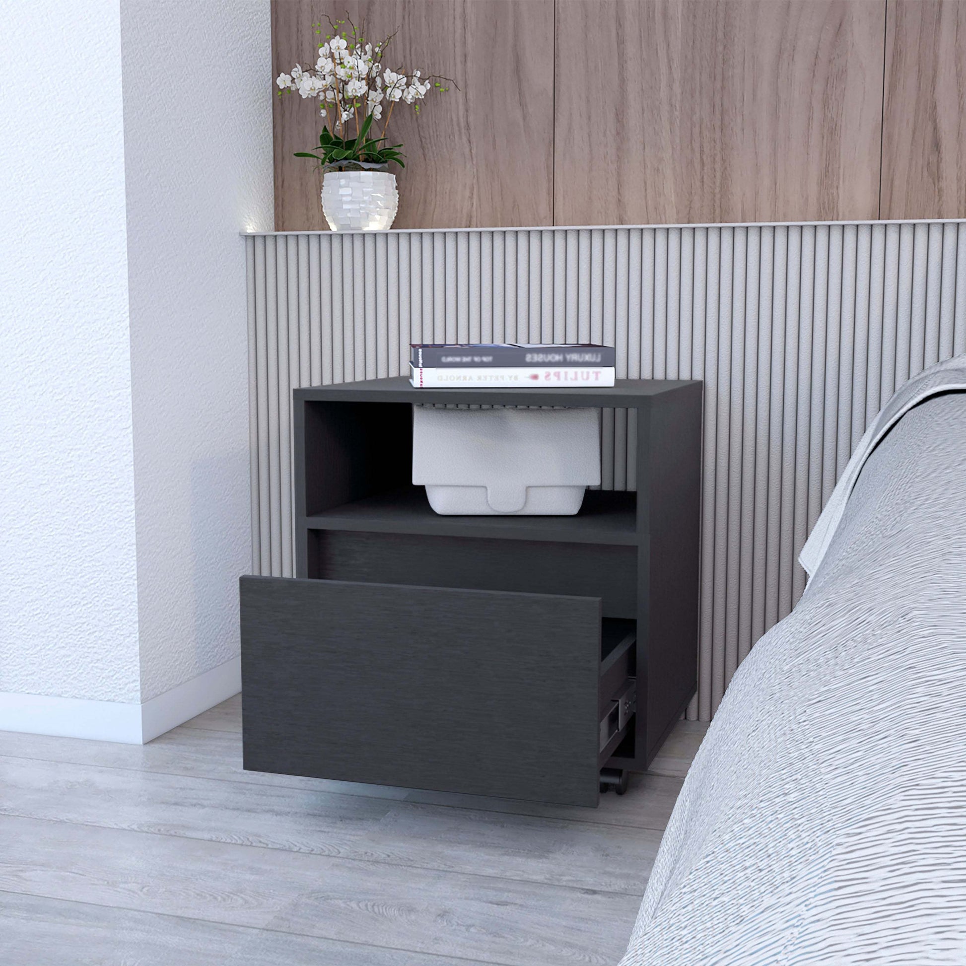 Introducing the versatile nightstand, designed for the contemporary individual with a dynamic lifestyle. Featuring an open-top shelf for easy access, a spacious drawer for secure storage, and convenient casters for effortless mobility, this nightstand combines practicality with witty style, to complement any modern decor.