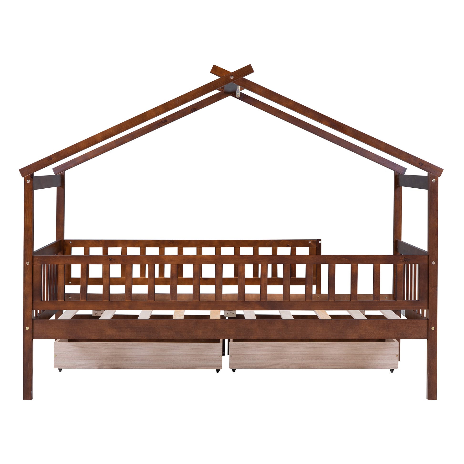 Twin Size Wooden House Bed with Two Drawers, Walnut
