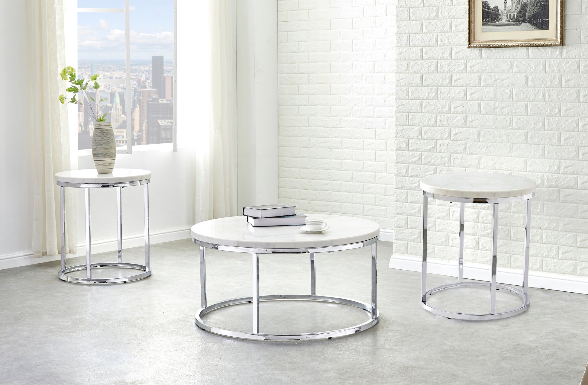 - Styling details include soft round shapes with white marble tops and chrome bases give tables a soft contemporary feel that will add sparkle to any room