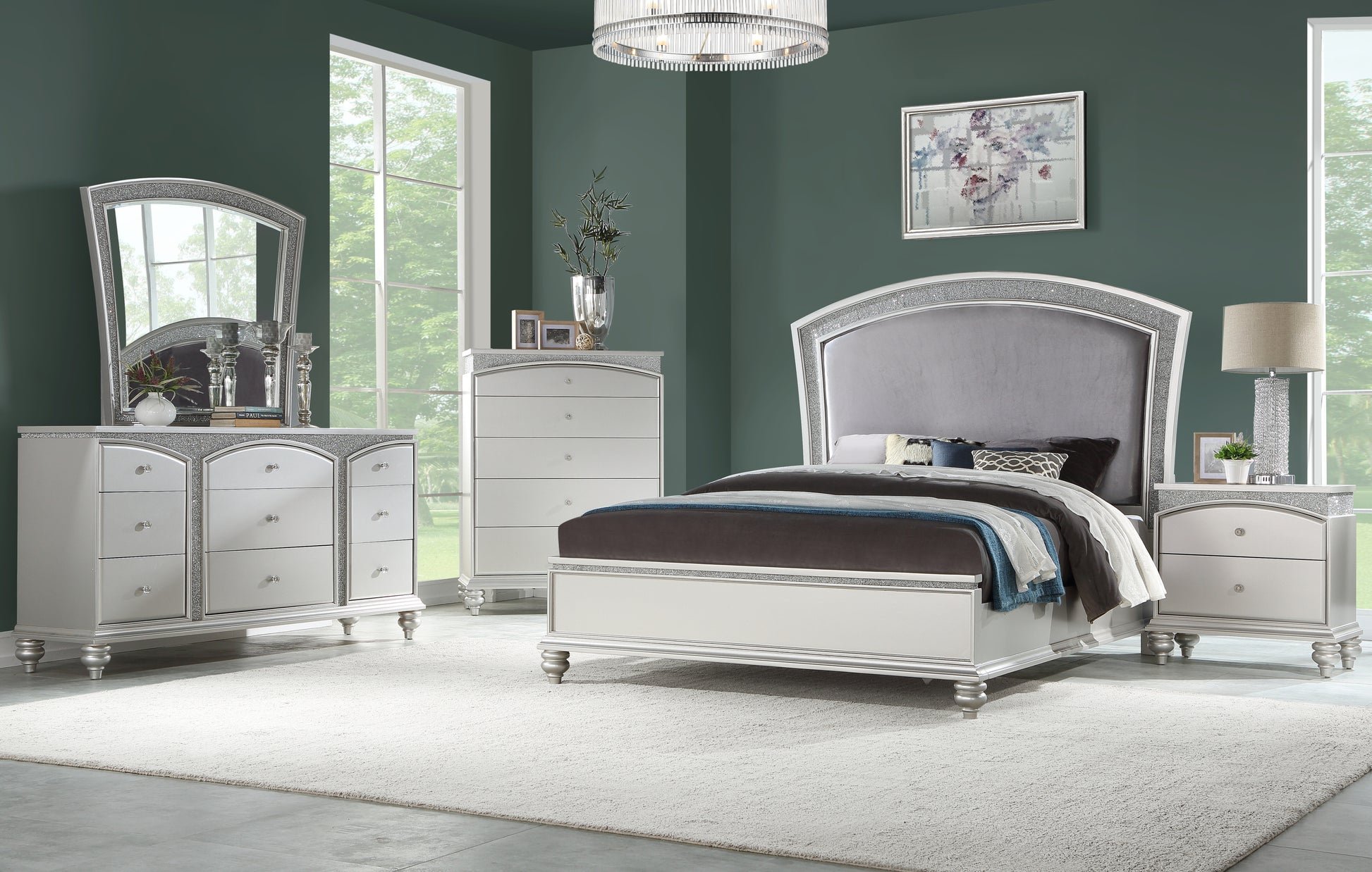 - This luxurious panel bed in a platinum fabric finish exudes elegance and style, perfect for a sophisticated bedroom setting.